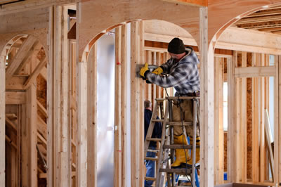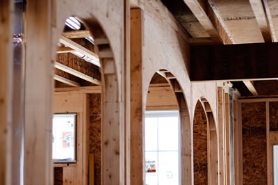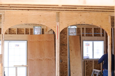 The framers are almost done. The windows and doors are all in, and they are framing up the arches over the doorways right now. I love the arches. They add curves to all of the straight lines of the building, and really add that bit o' somethin' that I really dig.