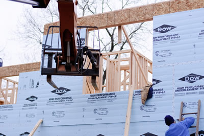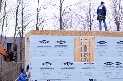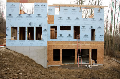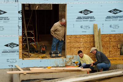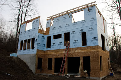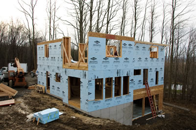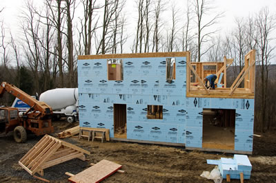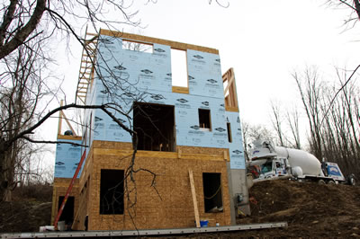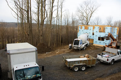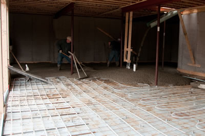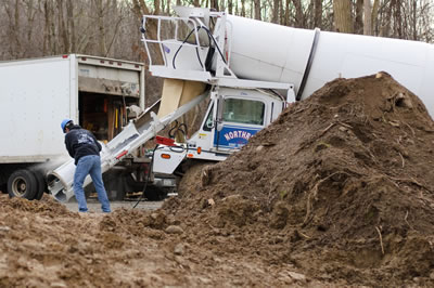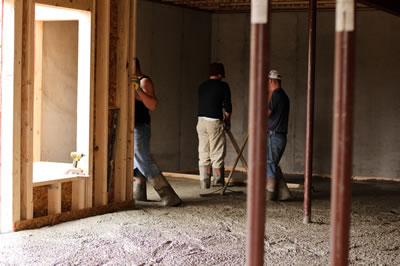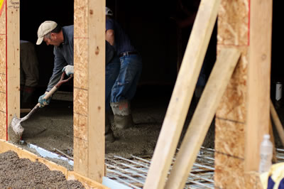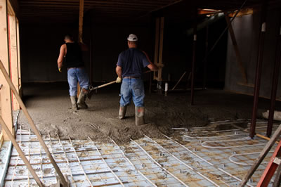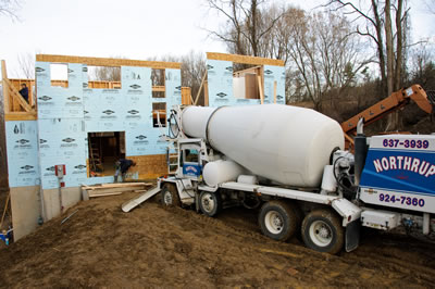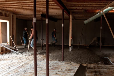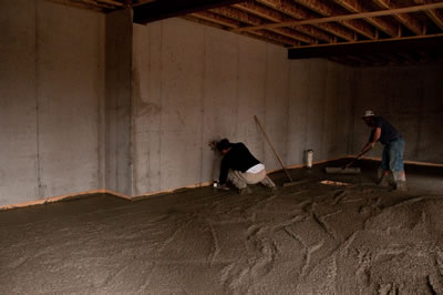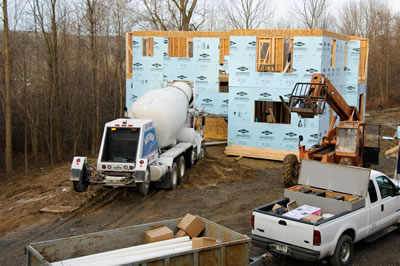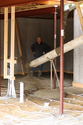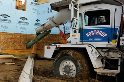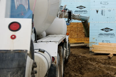 We have a basement floor! They pulled the cement truck right up to the house (it really sunk into the mud!), cut a hole in the wall, and poured the cement right down the stairwell. Here's a whole pile of pics showing the process...