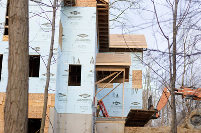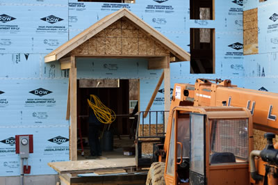Today Keith and the guys put the entry on the house. I have to say that it is great to have such knowledgeable people doing our house. Keith and I talked at length about the pros and cons of putting the entryway at this height or that height and what it would mean for the window above and the door below. And it ended up in the exact right place! (which, incidentally, matched the plan - kudos to Mike/Melody! :-)
