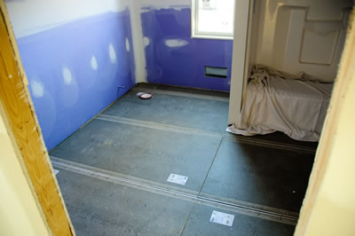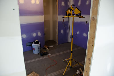 Tim and I worked on the tile for the bathrooms and the mud room. Actually, not the tile yet, but just getting the cement board tinsetted down. I've actually beenworking on it for two days, but real progress wasn't made til Tim arrived to help today. :-). We now have the cement board put down in the master bath, part of the family bath, and all of the cement board has been cut and put in place in the mud room. This was thanks to Mike and Tim both working on the mud room.