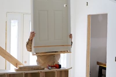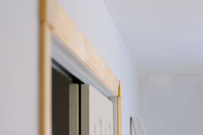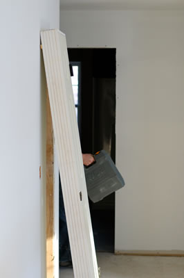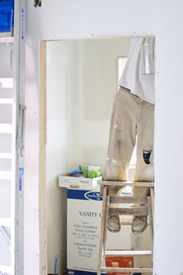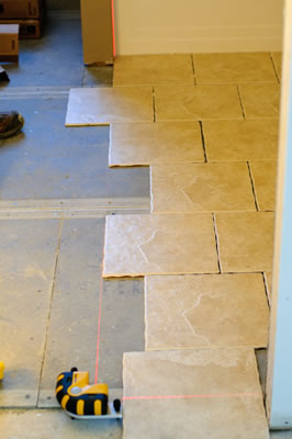 Today was a big day at the house! Tim laid down some of the tile in the family bath, the painters/trimmers installed a couple doors and trimmed out Gigi's room, I laid out the tile in the master bath, and the cabinets were delivered and the installers got a good start on getting them all installed! Whew! Lots going on, so let's get to the pics!